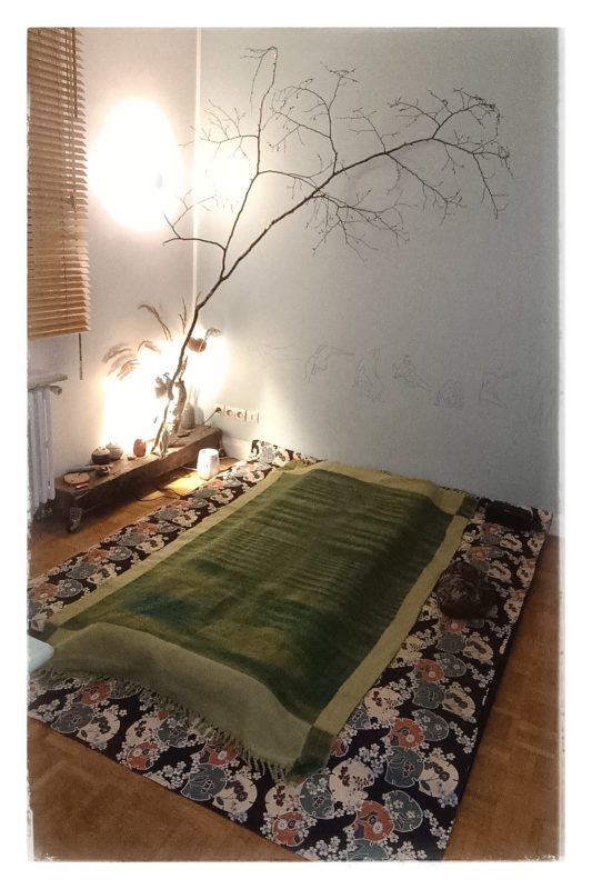 La salle de massage dans laquelle je vous accueille est celle-ci. Toute douce et calme, tatamis recouverts d’un lourd tissu japonais, des dessins sur  un mur de quand je fréquentais les ateliers de dessin de nu, des tableaux que j’aime bien sur un autre, une branche d’arbre qui veille sur vous pendant la séance.  La lumière peut être tamisée.  Les playlists que j’utilise ont été soigneusement élaborées pour vous permettre de partir sereinement dans votre massage.